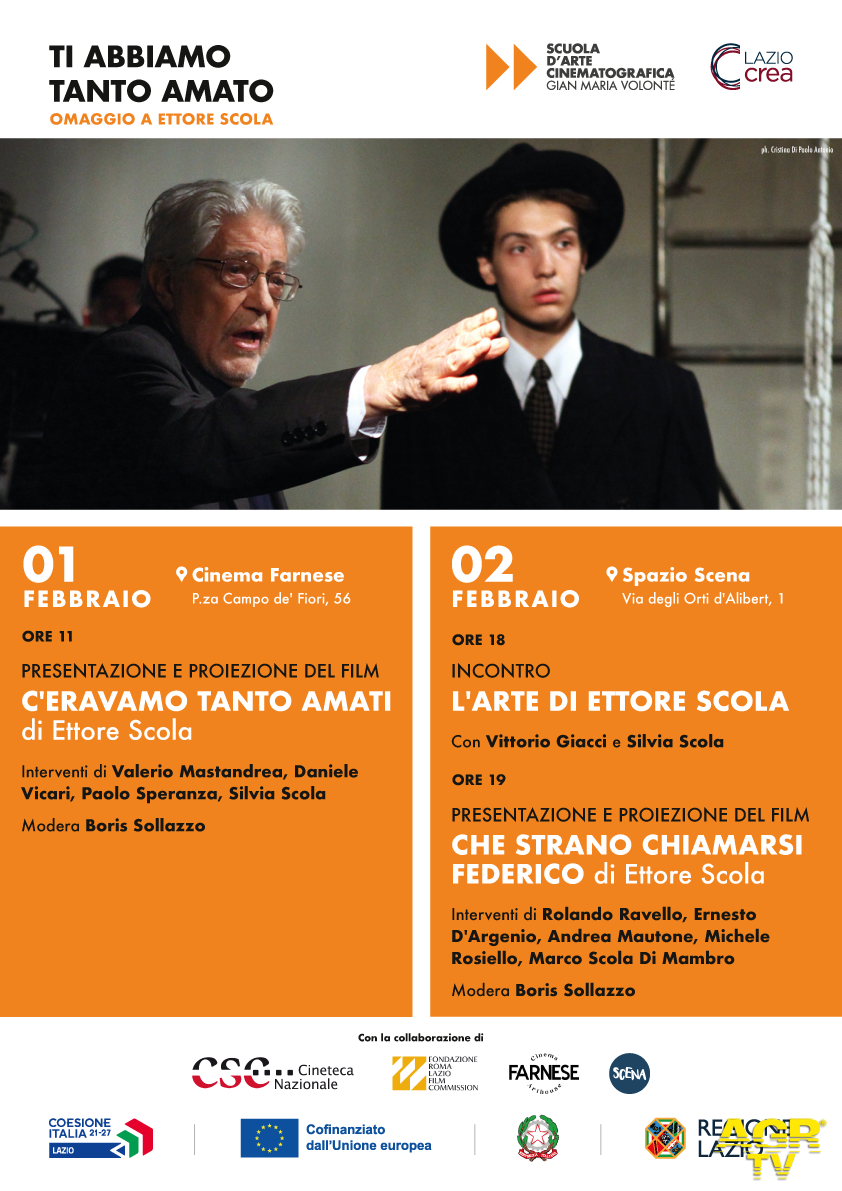 Il giorno successivo, lunedì 2 febbraio, lo Spazio SCENA ospiterà un nuovo momento di approfondimento. Alle ore 18.00, è previsto l’incontro dal titolo “L’arte di Ettore Scola” in cui sarà ripercorso il lavoro del regista, attraverso un dialogo tra Silvia Scola e Vittorio Giacci, autore del saggio Ettore Scola. L’ultimo enciclopedista (Bulzoni), che analizza in profondità tutta l’opera di Scola, con ampi riferimenti alle sue fonti culturali, storiche e artistiche. A seguire, alle 19.00, sarà proiettato Che strano chiamarsi Federico, l’ultimo film diretto da Scola, presentato nel 2013 alla Mostra del Cinema di Venezia. Una dichiarazione d’amore e d’amicizia a Federico Fellini, ma anche un’opera intima e personale, un racconto del rapporto tra due grandi artisti, narrato attraverso ricordi, immagini e invenzioni. Il film vede nel cast anche Michele Rosiello, Andrea Mautone ed Ernesto D’Argenio, giovani attori cresciuti professionalmente anche grazie alla formazione ricevuta proprio alla Scuola Volonté. Con loro interverranno Rolando Ravello e Marco Scola Di Mambro, in un incontro moderato ancora una volta da Boris Sollazzo.